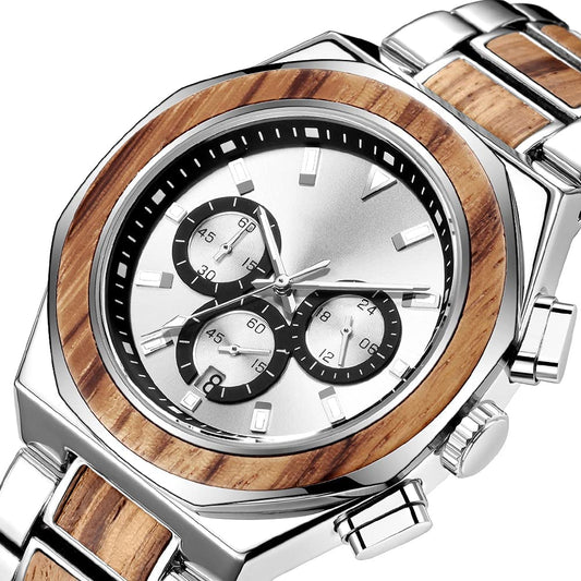 Men's Wooden Watch Quartz Movement with 3 Sub-dial Date Display Wood & Stainless Steel