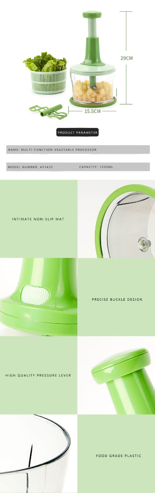 - Stainless steel blade suitable for chopping vegetables, preparing salads...