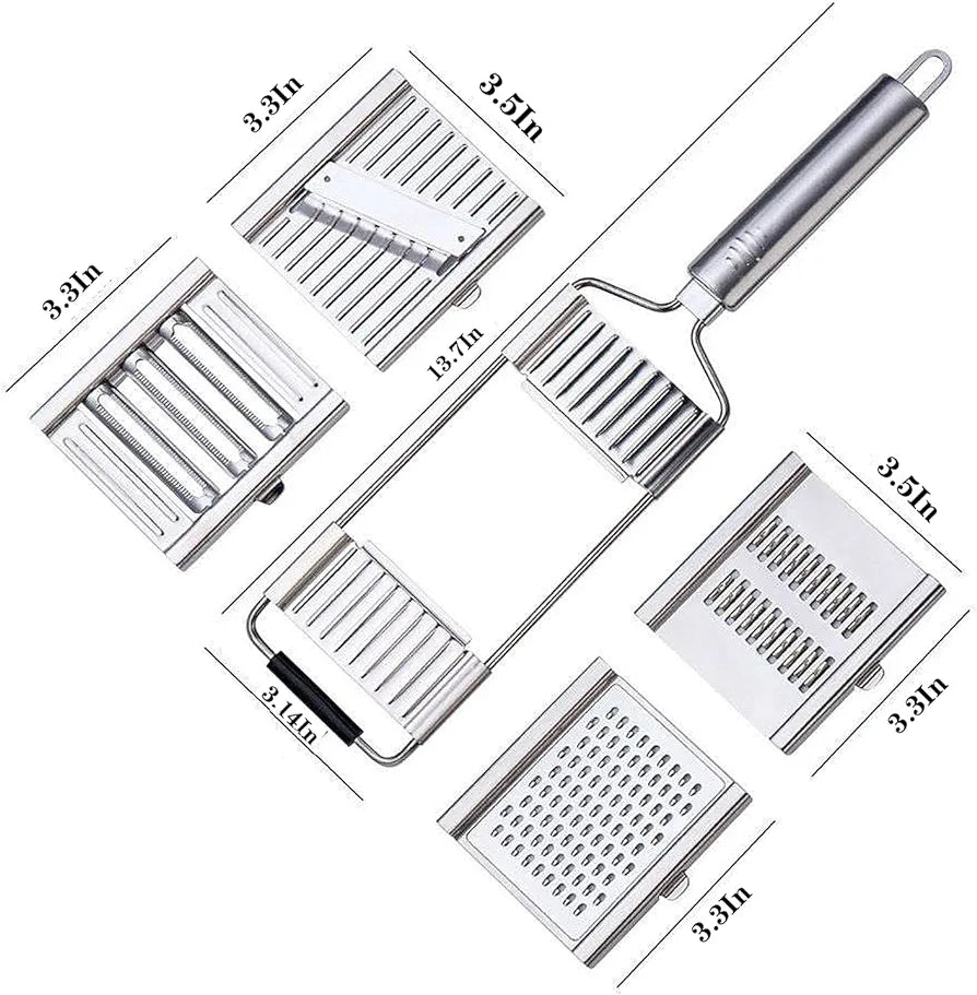 - Interchangeable blades meet all your slicing, grating, zesting, shredding and dicing needs. Easy to cut various food, chocolate, potato, tomato, onion, garlic, cucumber and cabbage in different shapes, sizes and thicknesses, helping you make healthy and organic meal quickly.