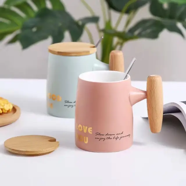 - European style 390ml matte ceramic coffee mugs with wood lid and wood handle matte