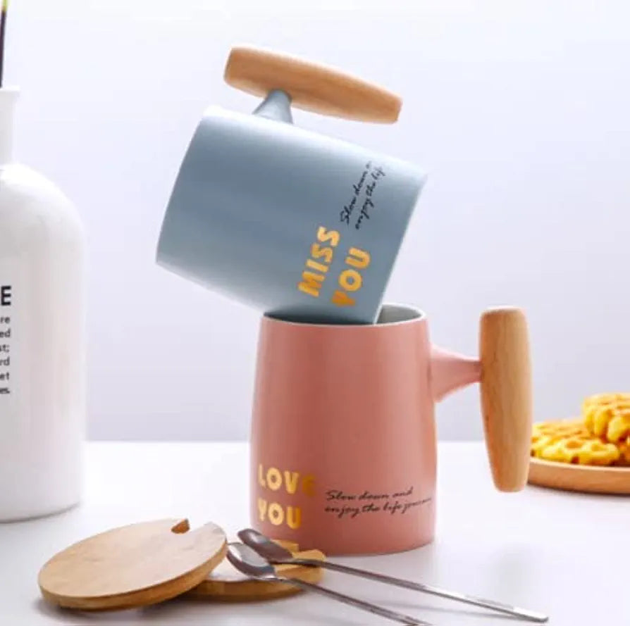Ceramic Coffee ,Tea Mug with Wood Lid and Handle and spoon