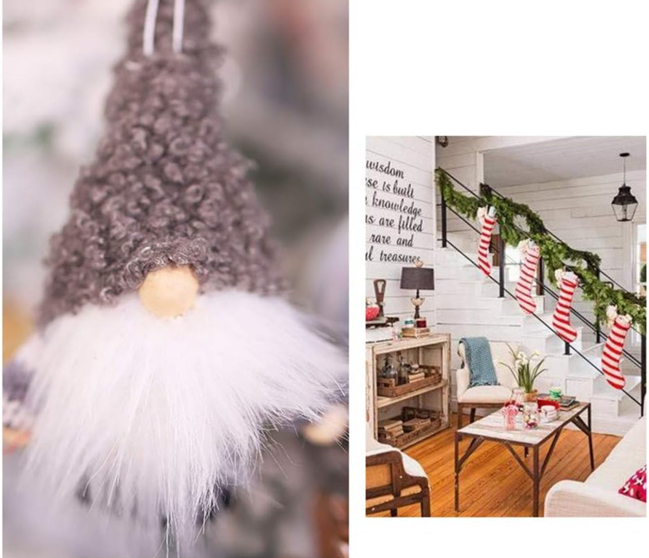 Features:Made out of high-quality cloth and comes with a sturdy hanging loop to ensure you can hang it safely and easily.It's perfectly Holiday decorations.Material: Burlap, fluff, fleece fabric. All the details are incredible crafted and look delicate, Perfect for filling with a range of gifts.Christmas theme design, let you have a more intense Christmas atmosphere.This product can be used not only to hold gifts but also to decorate Christmas parties.Stylish and simple, yet beautiful, it is the best choice for your Christmas