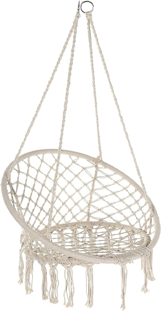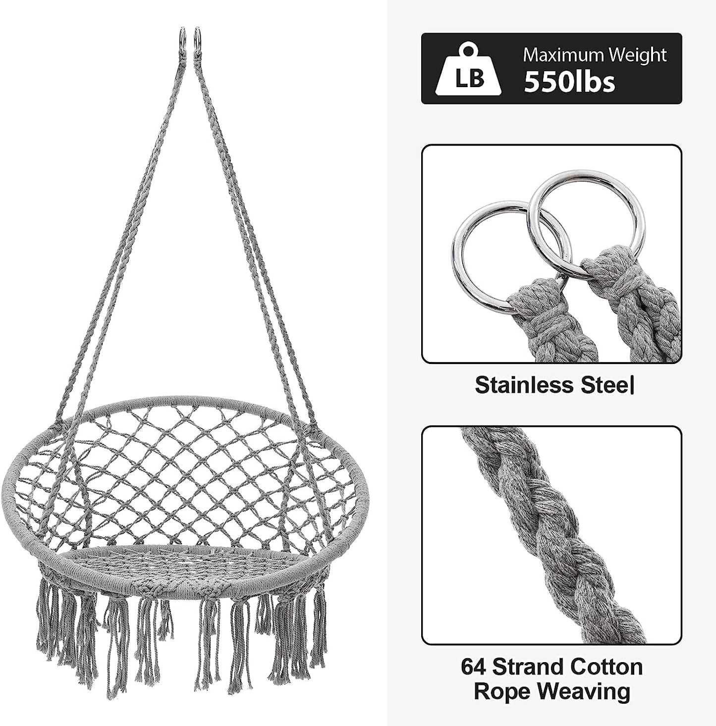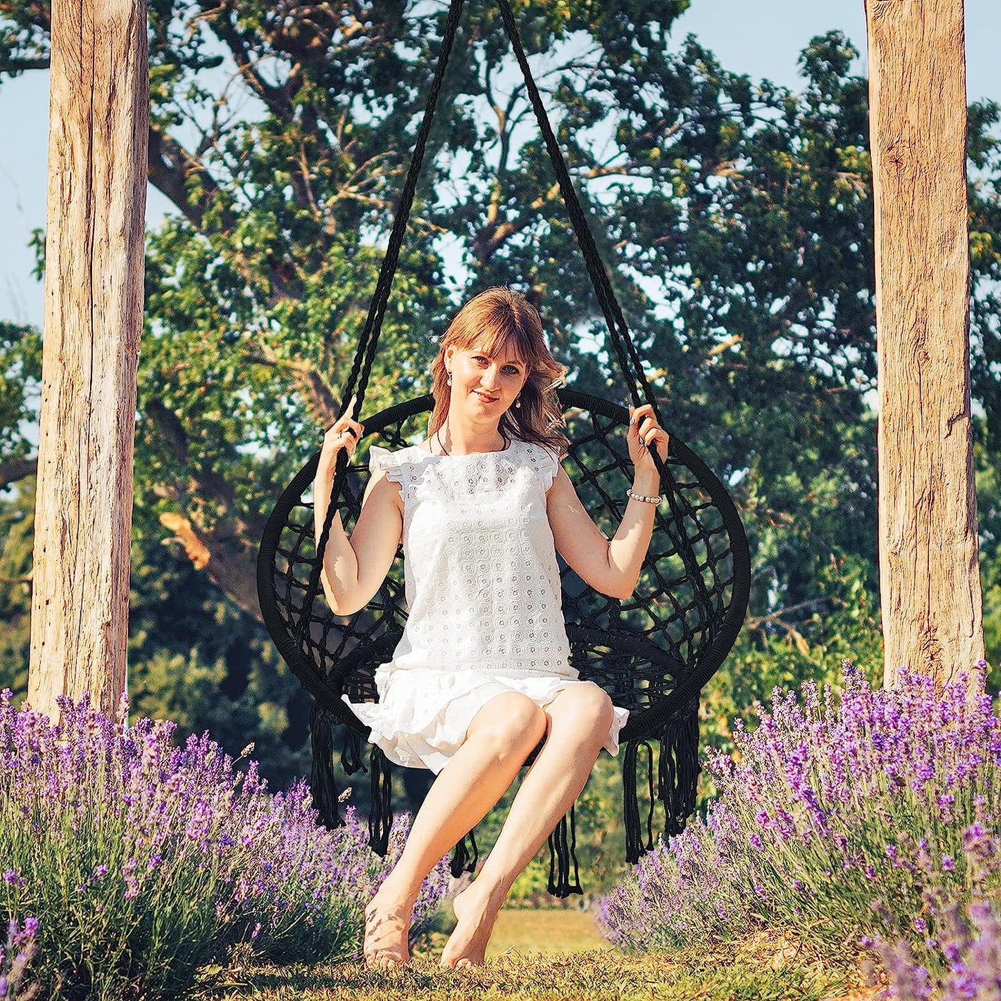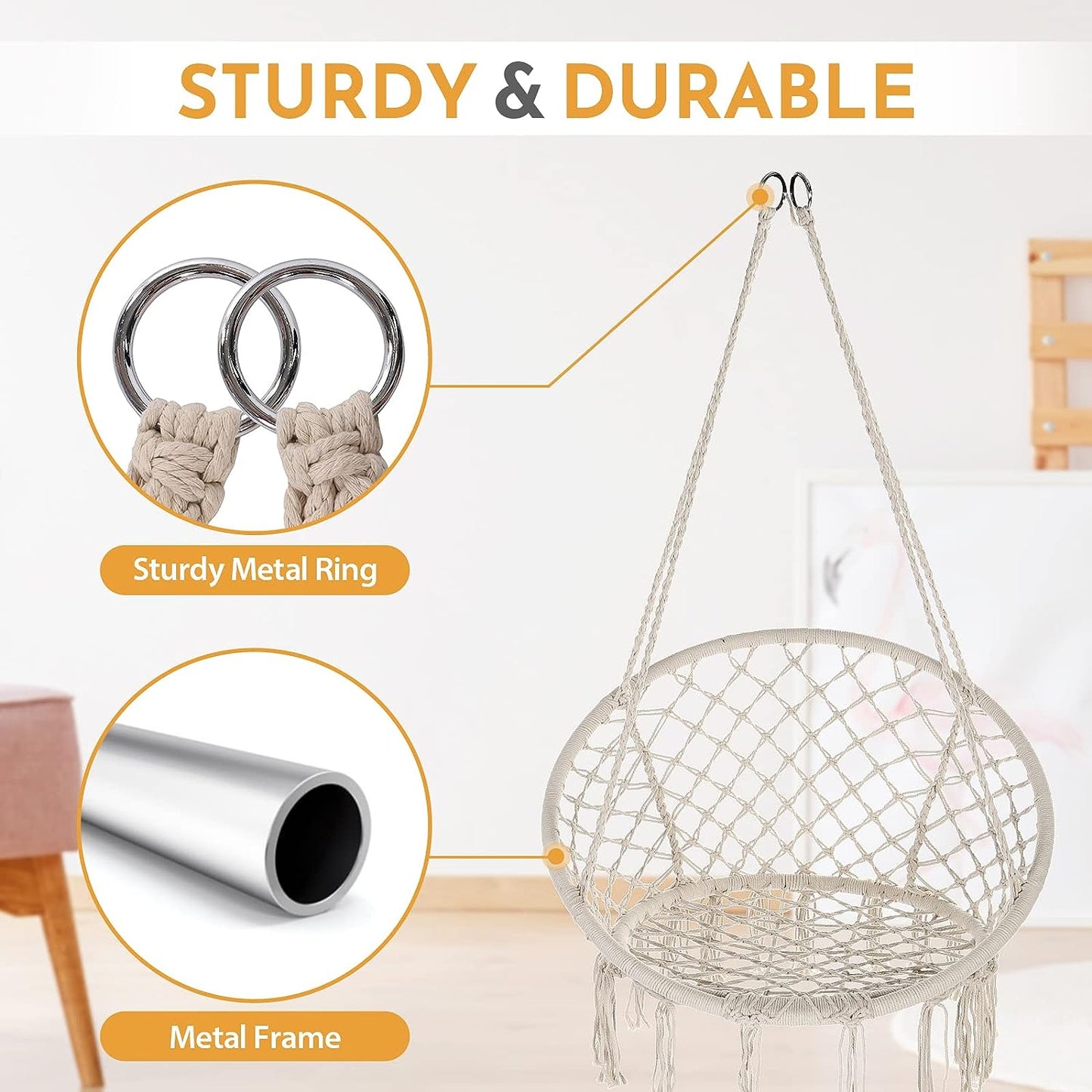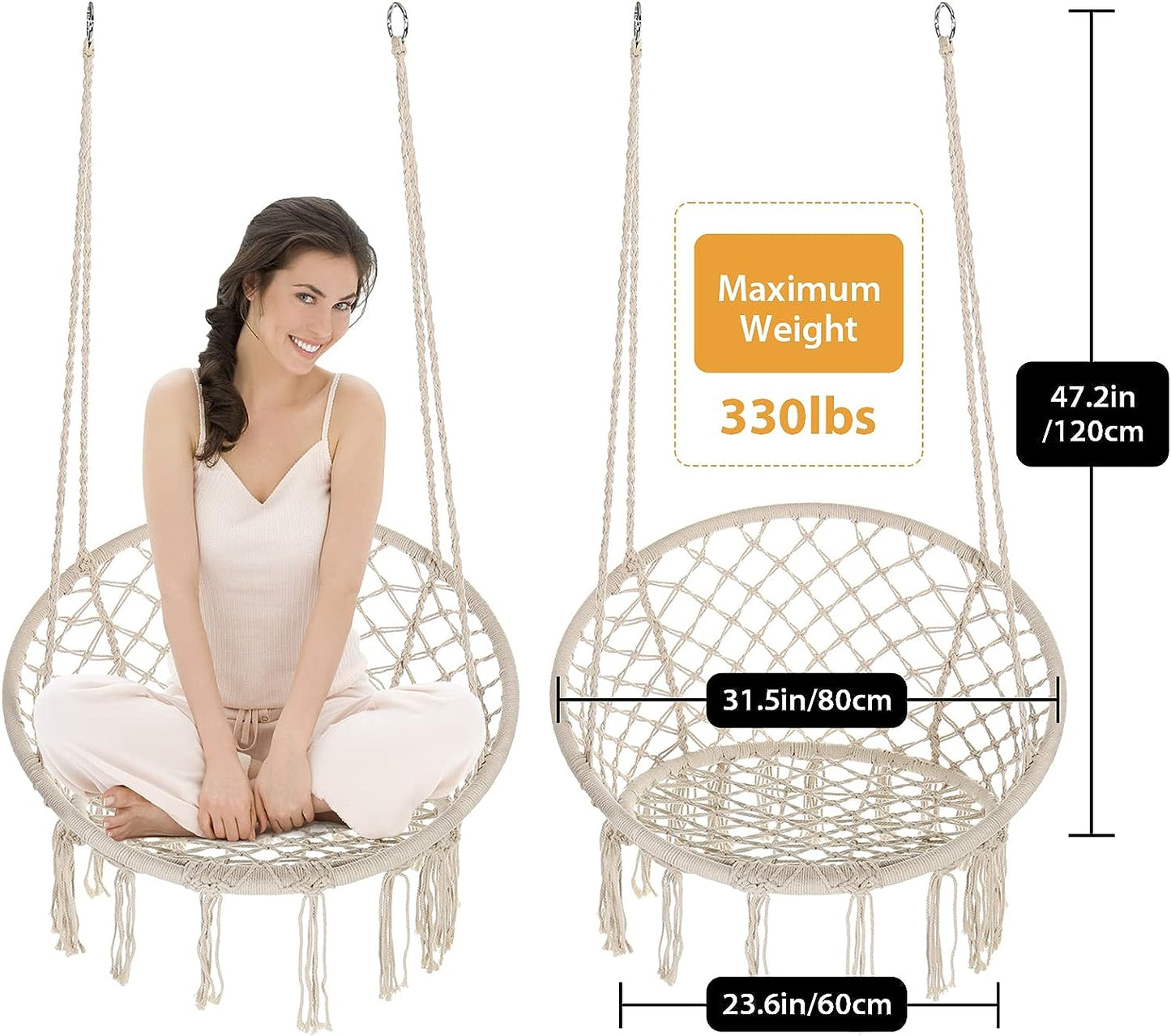 - Firmly woven thick cotton rope with excellent metal framing ensures the swing chair is sturdy and supports up to 330 pounds.