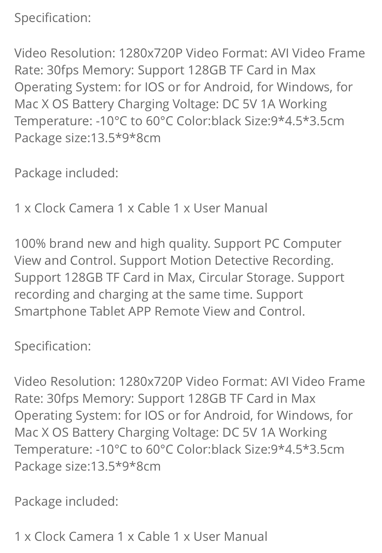 - Clock Camera x 1 (Memory card is not included)