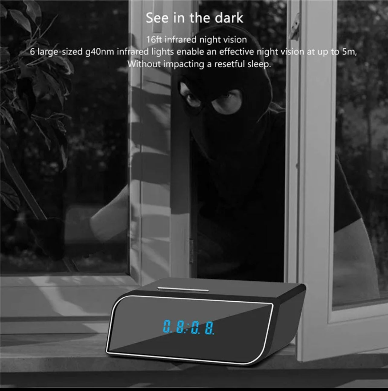 It has IR's which allows you to record in the dark about 10 feet away. The clock is rechargeable and portable. It records in HD 720p so a clear crisp quality video is recorded to the internal SD card.