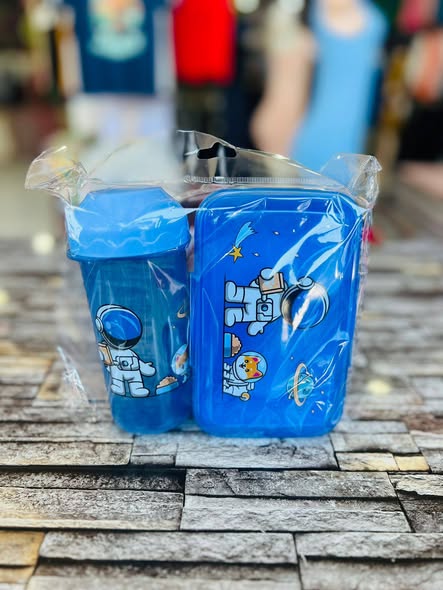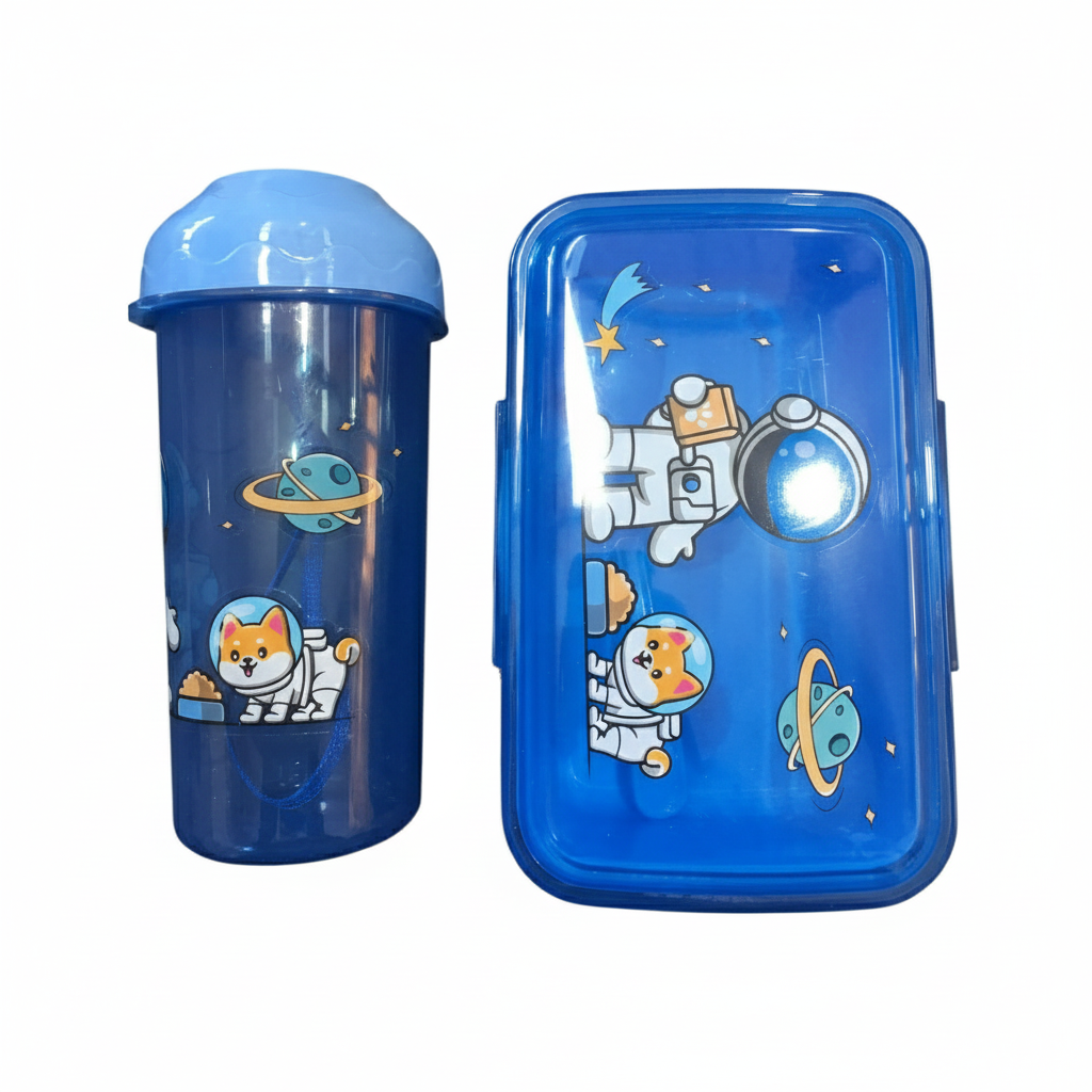 Make mealtime more fun with this adorable space-themed lunch set, designed especially for kids. Featuring a vibrant blue outer space design with playful illustrations of an astronaut, a cat in a spaceship, and colorful planets, this matching lunch box and water bottle set is perfect for school, outings, and everyday use.