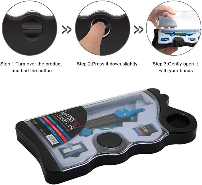 - Multiple functional Geometry sets including: 1 Pencil,1 Pencil sharpener, 1 ruler(15cm), 1 triangle (90° & 30°/60°),1 isosceles triangle (90° & 45°/45°), 1 protractor,1 Graphic Compass (Max diameter 30cm)and 1 eraser.( Unit: cm,mm)