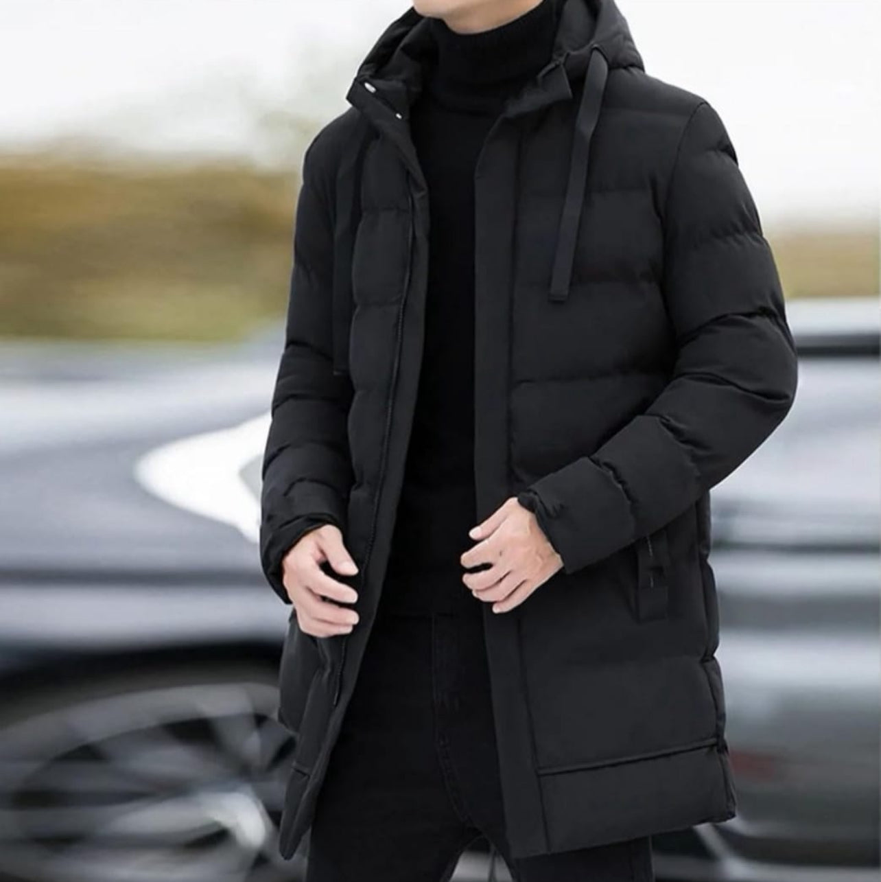 Mens Zipper Padded Jacket With Hood Long Sleeve Warm Long Coat