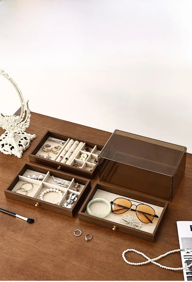 Organize and display your jewelry in elegant style with the MHome Three-Layer Jewelry Box. Designed with a classic walnut wood-grain finish and a transparent viewing lid, this luxury jewelry organizer combines vintage charm with modern functionality. Its large-capacity, multi-drawer layout keeps rings, earrings, necklaces, bracelets, and accessories neatly arranged, protected, and always within reach.