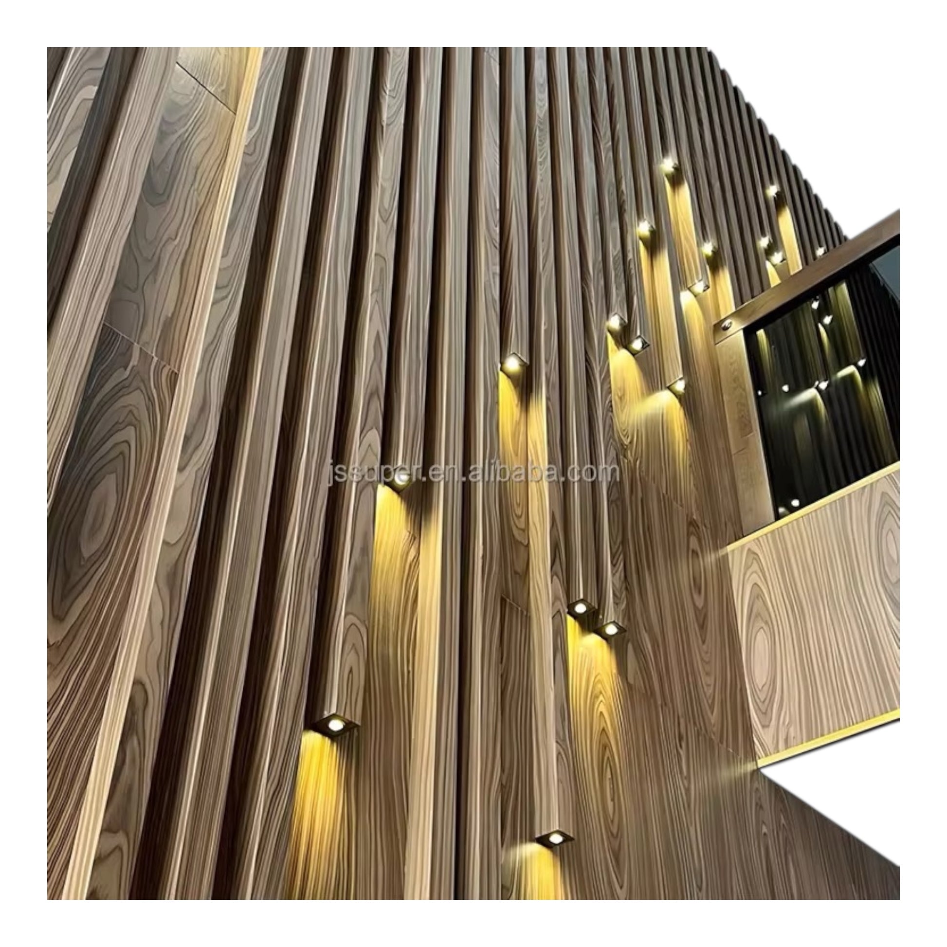 - Lighting: Built-in warm LED light boxes are integrated into the gaps or ends of the slats, creating ambient indirect illumination.