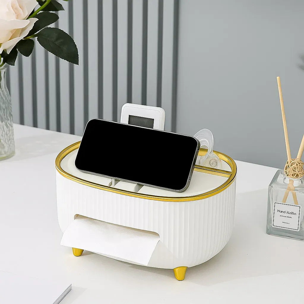 Upgrade your space with the MHome Elegant Tissue Dispenser with Phone Holder. This sleek, multifunctional accessory keeps tissues within easy reach while securely holding your smartphone. Extra top compartments provide storage for accessories, makeup, or jewelry, making it perfect for bedrooms, bathrooms, or office desks. The modern design adds sophistication while offering practical convenience.