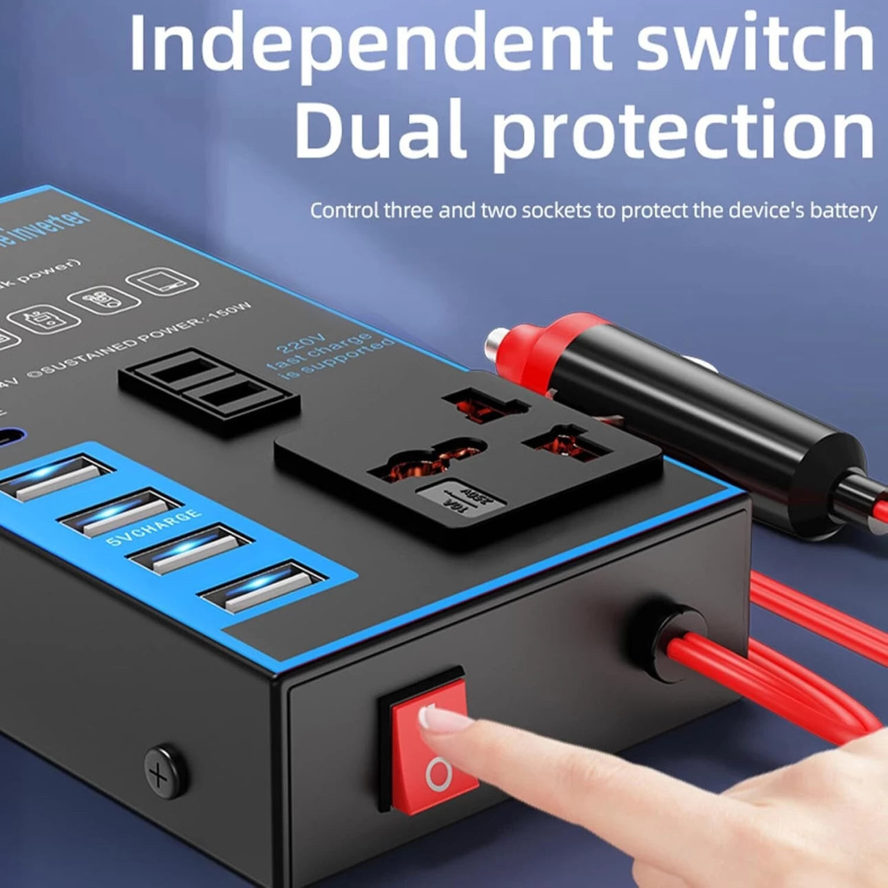 - Versatile USB Charging Our Car Power Inverter comes equipped with multiple charging ports, including 4 USB ports, 1 PD fast charging port, 1 three socket, 1 dual socket, and 1 cigarette lighter hole. Capable of handling multiple devices simultaneously. Keep your family's electronics charged and ready for journey