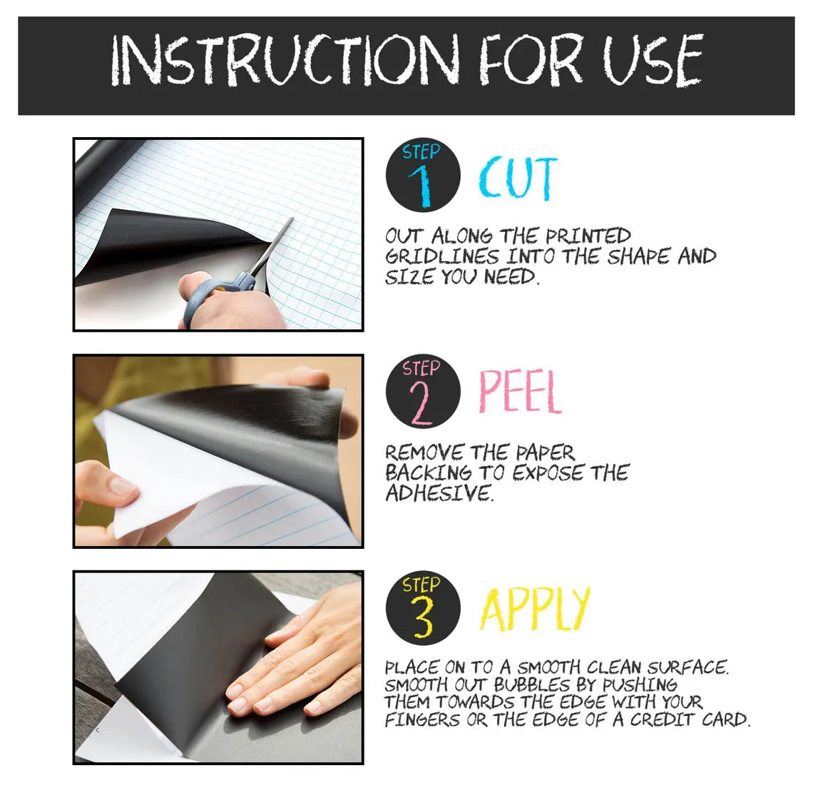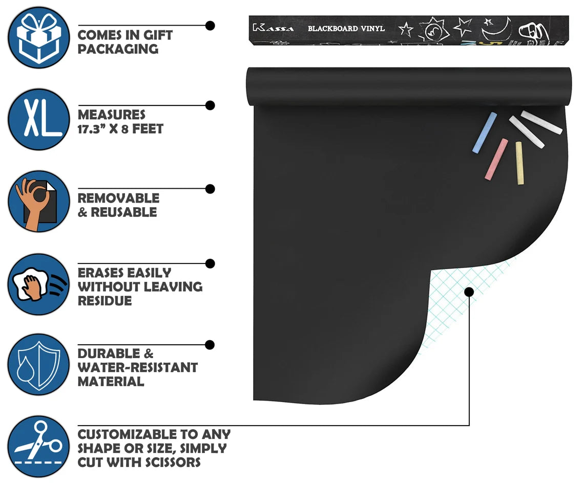 Stick Self Adhesive Chalkboard Wall Sticker with 5 free Chalks. A convenient peel and stick chalkboard sticker to express your creativity with chalk! Made out of a strong vinyl material for long lasting quality. Ideal for walls, doors, cupboards and fridges.