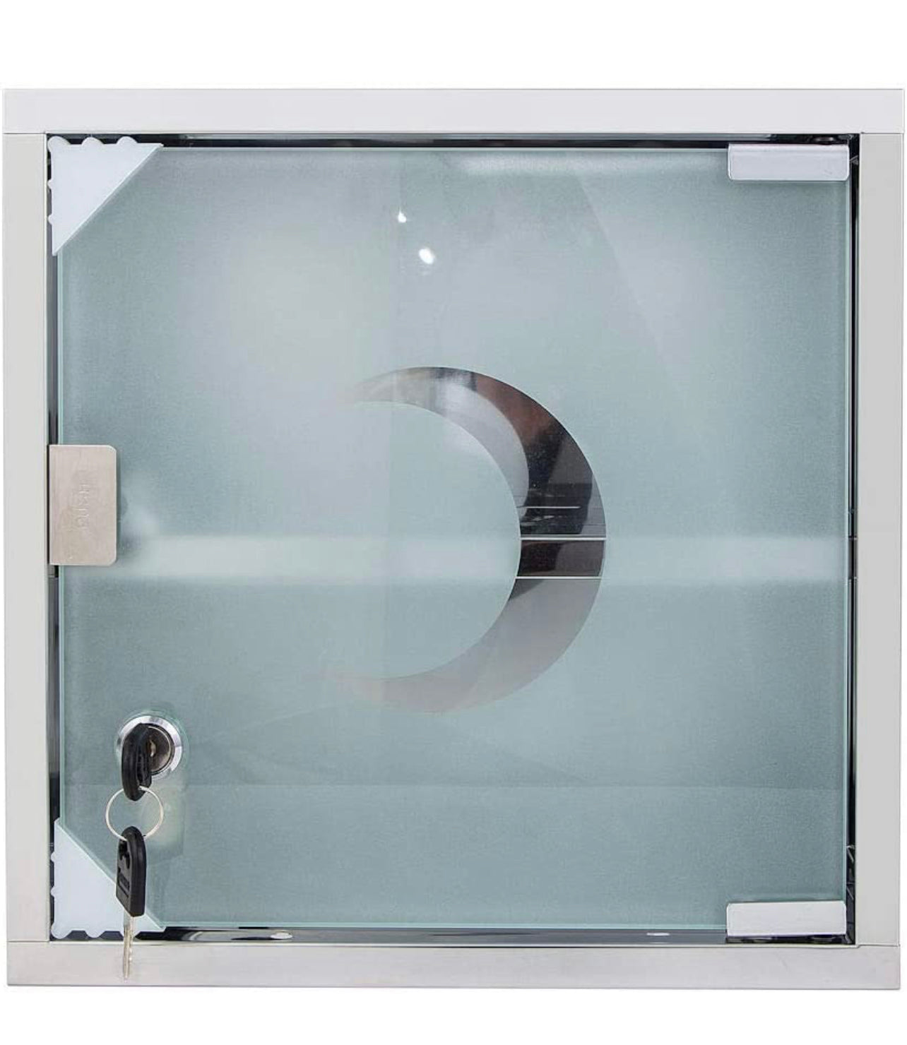 - This medicine cabinet has a milk glass door that closes with a magnetic pressure closure. For extra security, you can easily lock this door with a key (2x keys are included)