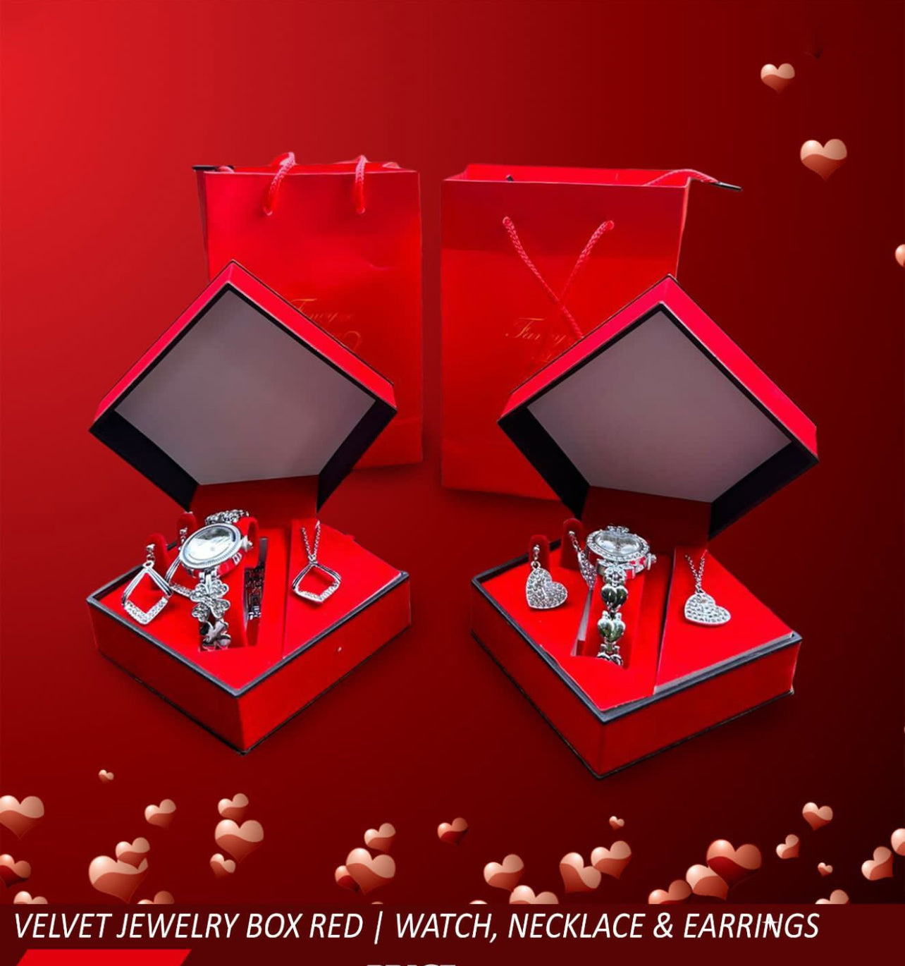 Valentine’s Gift Set Velvet Red Box Inc Watch,Necklace & Earrings 3pc