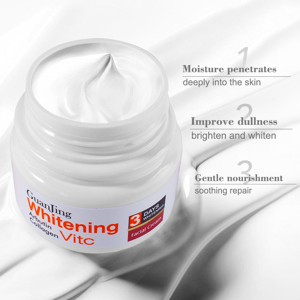 Guanjing Vitamin C, COLLAGEN & Licorice root Face Cream. Brightens, Removes Darkness, Whitens dark Pigments, Moisturizes & Smooths,repairs & Brightens the skin, Whitens & Removes dark Pigments, Moisturizes, Improves & Removes dull skin, Makes skin smooth, Fair, elastic & beautiful.