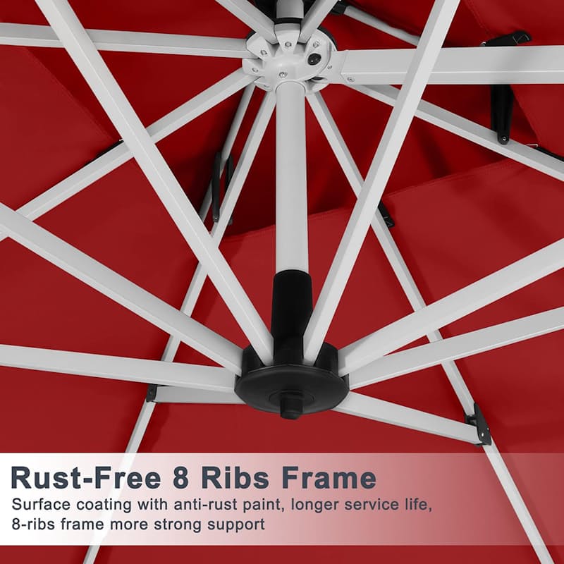 - This offset patio umbrella has a size of 3x3m and a larger canopy, perfect for tables of 6-8 people. The unique double-top umbrella design provides enhanced wind resistance and stability. The versatile patio umbrella is suitable for many scenarios, such as gardens, decks, streets, or weddings, business parties. This model is equipped with LED lighting.