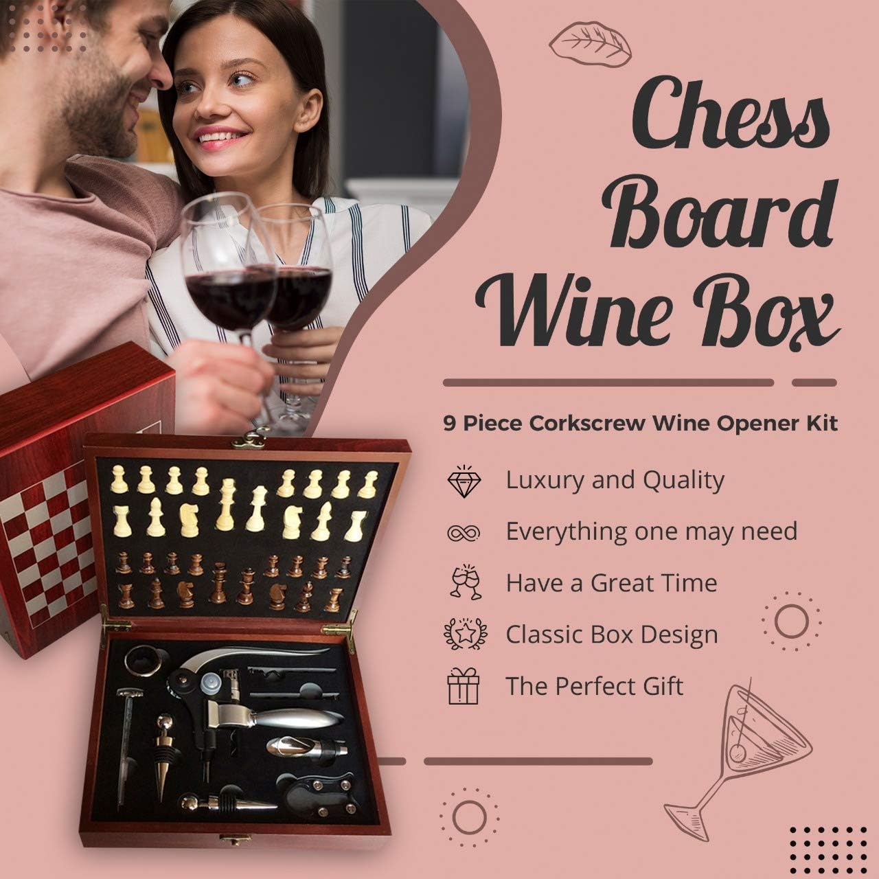 Uncork wine in a flash with our 2 in 1 Wine Opener Set and Chess set! Featuring 9 pieces crafted with zinc alloy and stainless steel for durability, plus a beautiful wooden-style box with molded inserts and a checkerboard on the lid, this all-in-one set is a must-have for wine lovers. The satisfyingly quick, easy up and down motion of the corkscrew opener works with both natural and synthetic corks, and the included accessories β aerator, drip ring, foil cutter, pourer, and stoppers β make sipping, pouring, and savoring even more pleasurable. An ideal gift for any occasion, this premium-grade set will thrill any wine enthusiast.