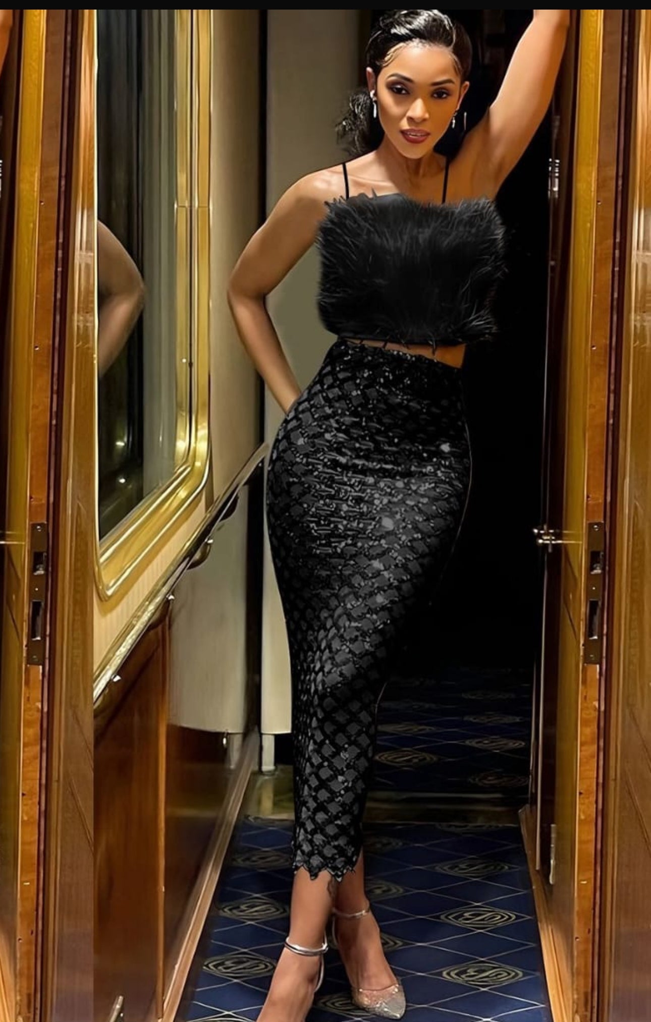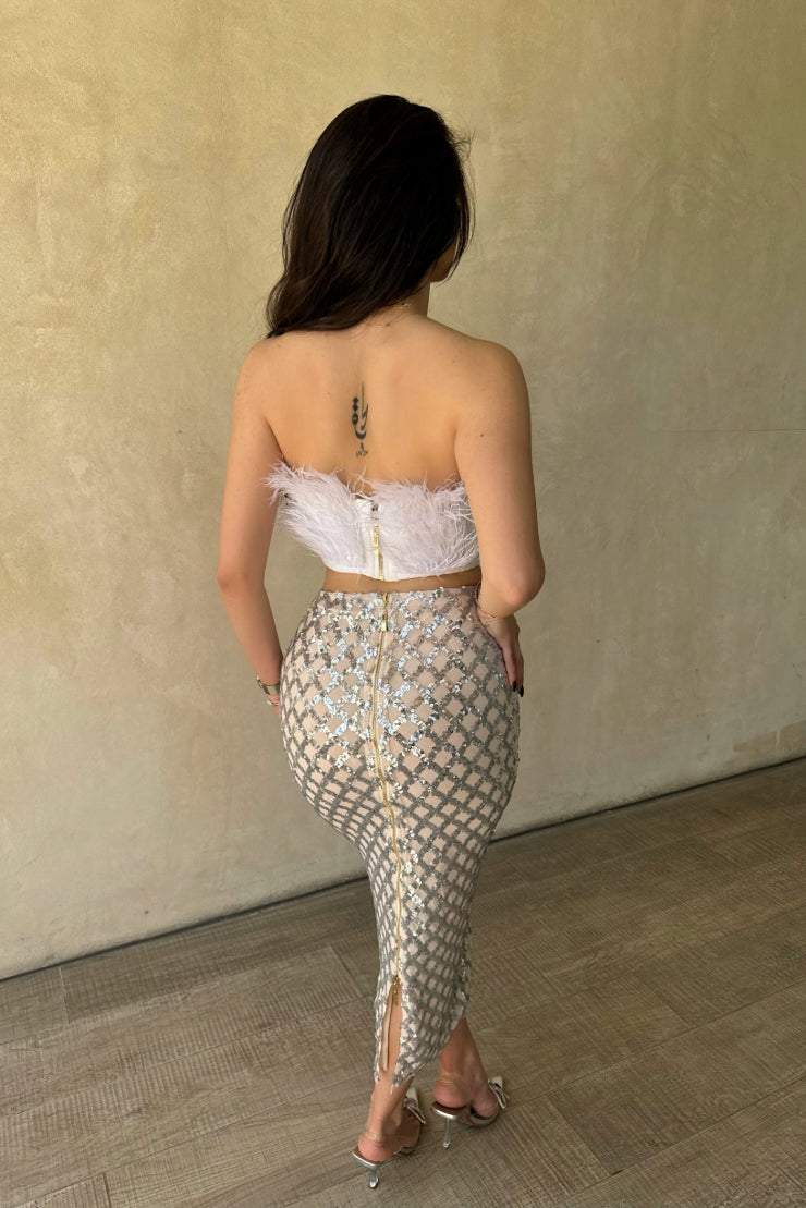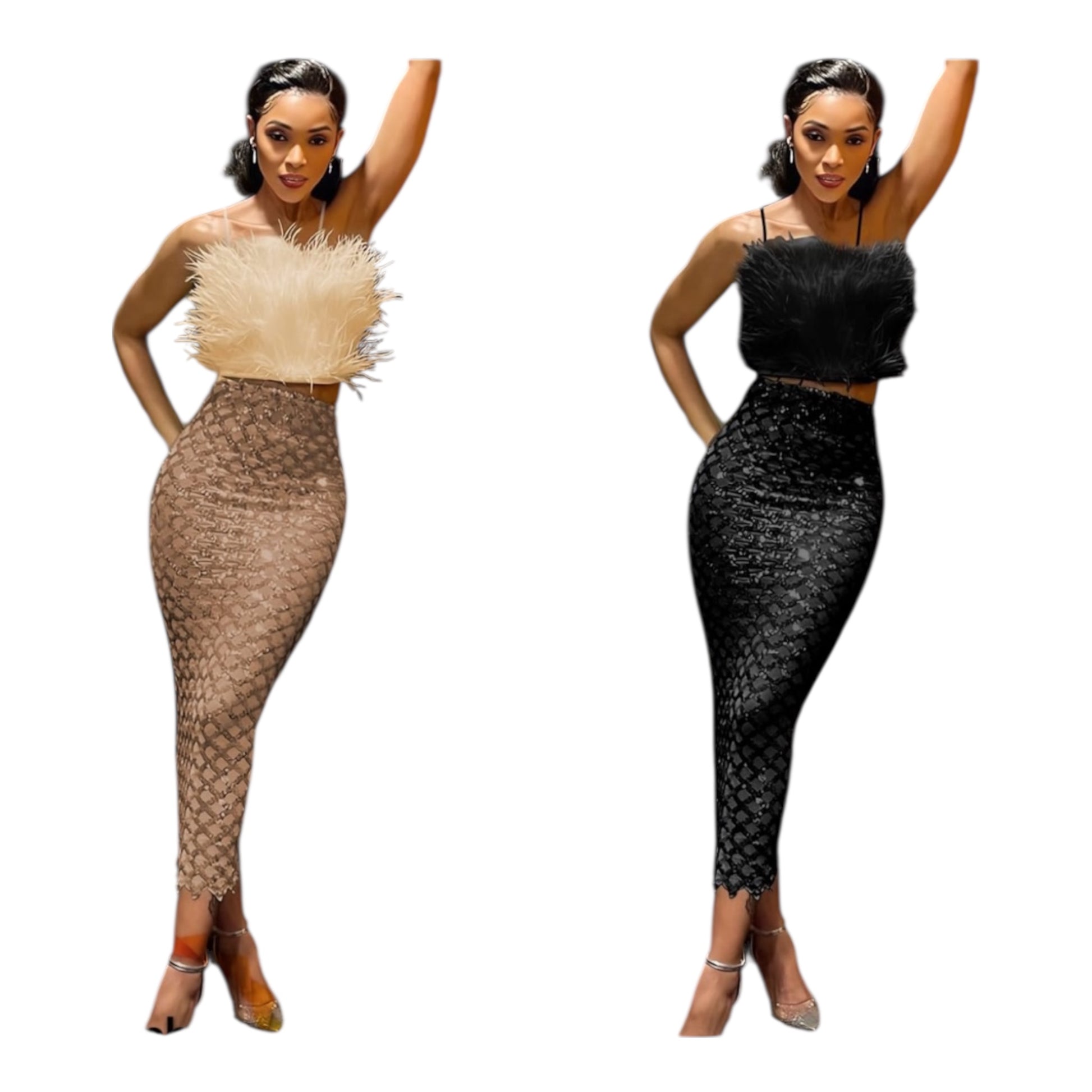 This Feather Top and Sequined Skirt Two Piece Dress Set is sure to make a statement. With its strapless crop top all covered with feathers and a high-waisted mini see-through skirt embellished with sequins, this two-piece set is perfect for any party or romantic occasion. Every detail radiates high-end luxury, from the sophisticated cut to the exquisite craftsmanship. Pick between two classic colors and add a touch of elegance to any evening with this unique and glamorous ensemble.