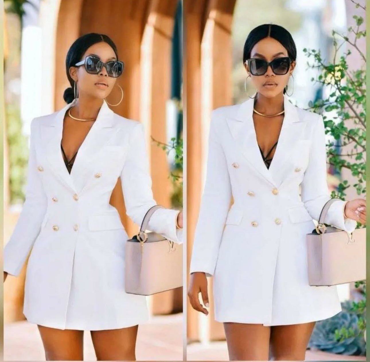 Classic blazer dress with gold button closure. Slim fit mini length dress with shoulder pads and faux pocket fronts. Made from a classic stretch spandex , available in red , black , white and beige. Sizes from S-2XL