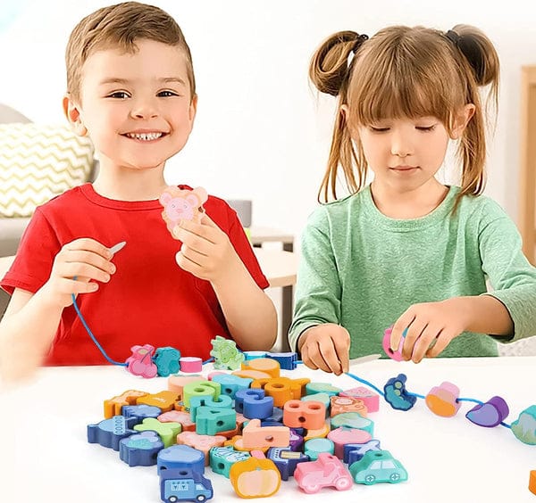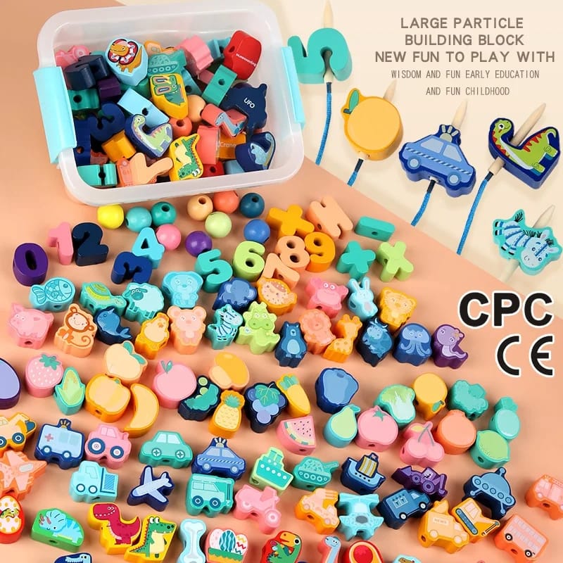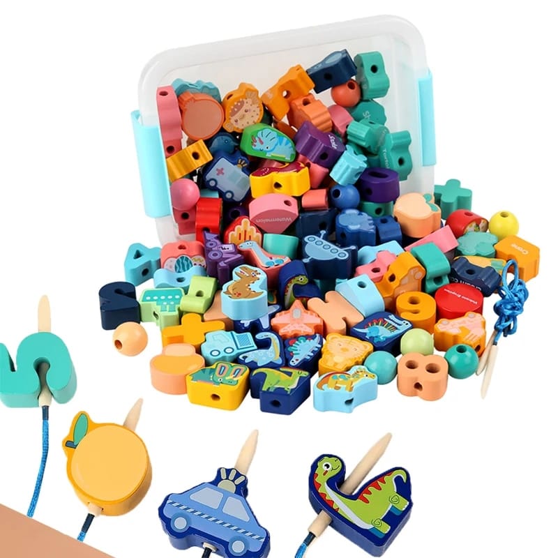 Wooden Blocks Lacing Beads Toy Puzzle Sorting Educational 60 Block Beads