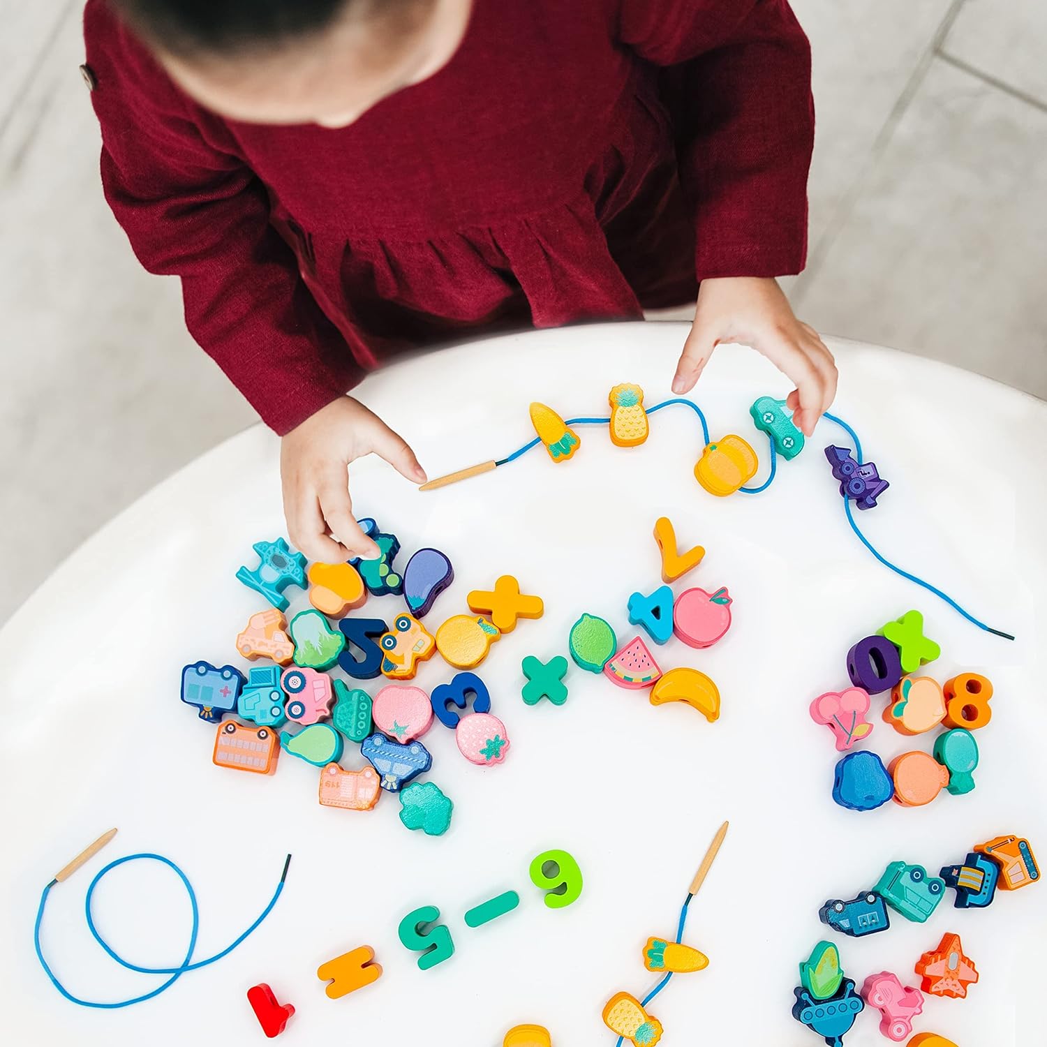 - Use this beads play with your child, make he fall in love with number and letter learning while he is lacing different shapes of bead puzzle. Otherwise, it can be threaded in different shapes, improving his imagination.